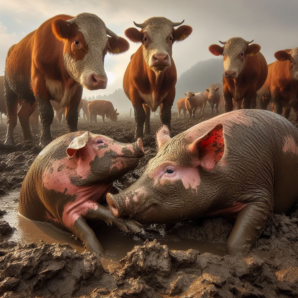 If you’re a pig, your priorities are getting everyone else as muddy as possible — and to the point where clearing away the mud to see what’s really going on becomes just too much trouble.